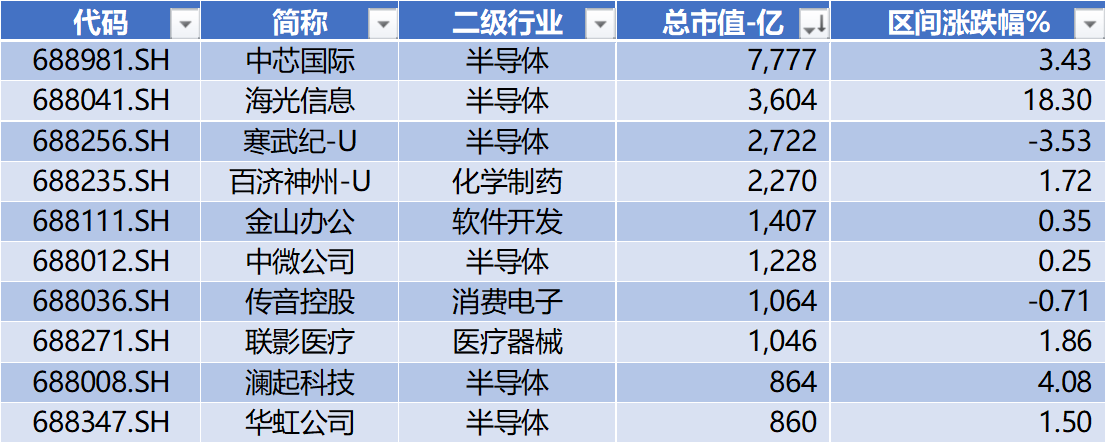 上图是本周科创板前十大权重公司呈现分化,半导体行业的海光信息涨18.3%居首,寒武纪跌3.5%居末。