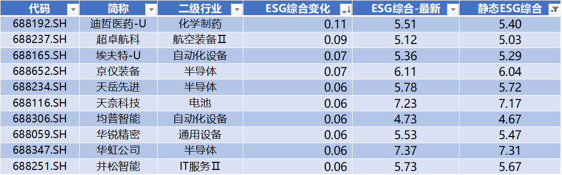上表是ESG评分变化上升的前十家公司(剔除新上市公司),分别为:迪哲医药-U、超卓航科、埃夫特-U、京仪装备、天岳先进、天奈科技、均普智能、华锐精密、华虹公司、井松智能。