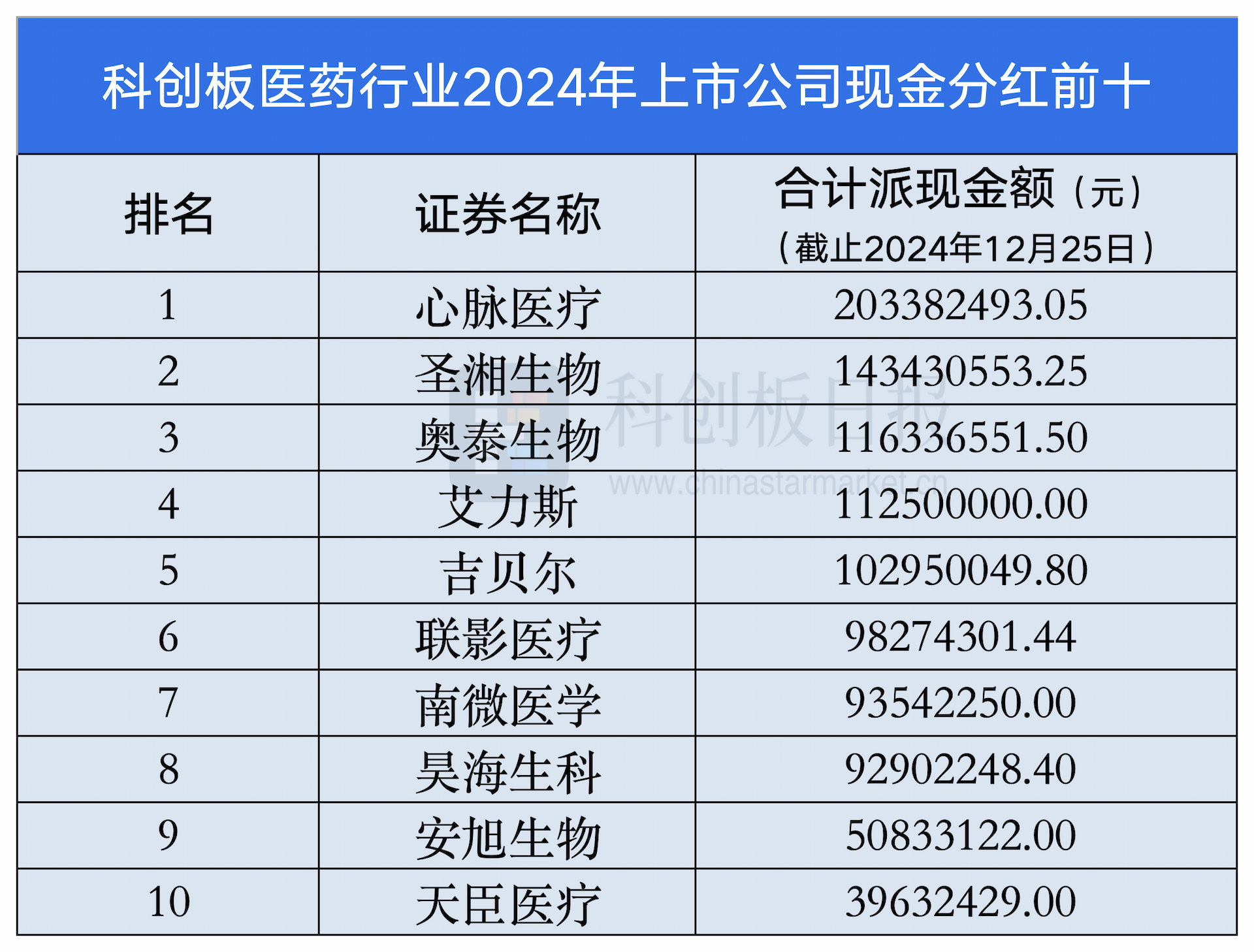 据财联社星矿数据提供数据显示,科创板医药行业2024年上市公司分红部分,排在前列的有心脉医疗(688016.SH)、圣湘生物(688289.SH)、奥泰生物(688606.SH)等。