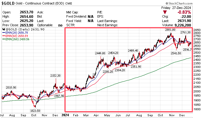 2024年迄今,纽约期金价格累计上涨了27%,至每盎司2637美元。这比标普500指数年内25%的涨幅还要高,与科技股占比较大的纳斯达克综合指数31%的年涨幅也相差不远。