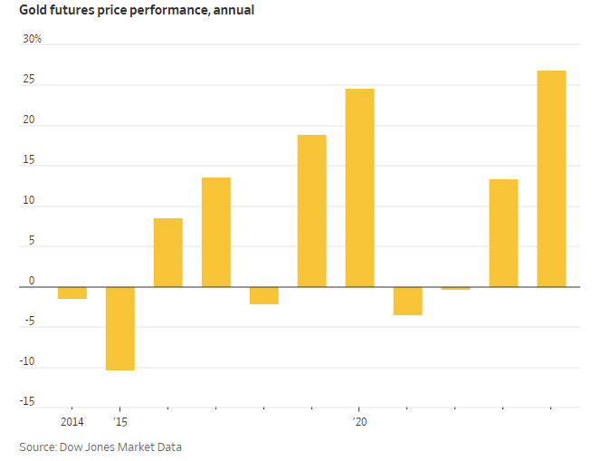 唯一的一次例外发生在四年前。黄金价格在2020年上涨约25%之后,在2021年下跌了3.6%。