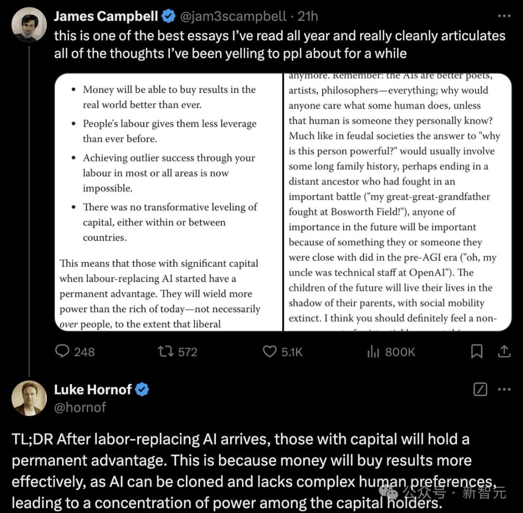 业内著名AI咨询师Luke Hornof总结道,「当能替代人类劳动的AI出现后,拥有资本的人将获得永久性优势。