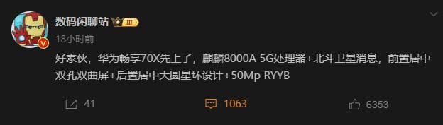 根据微博数码博主@数码闲聊站爆料,华为即将推出畅享70X新品手机,该机首发搭载全新麒麟5G处理器,支持北斗卫星消息并搭载50MP RYYB主摄,预计最快明年一月初直接上架华为商城和各线下门店。