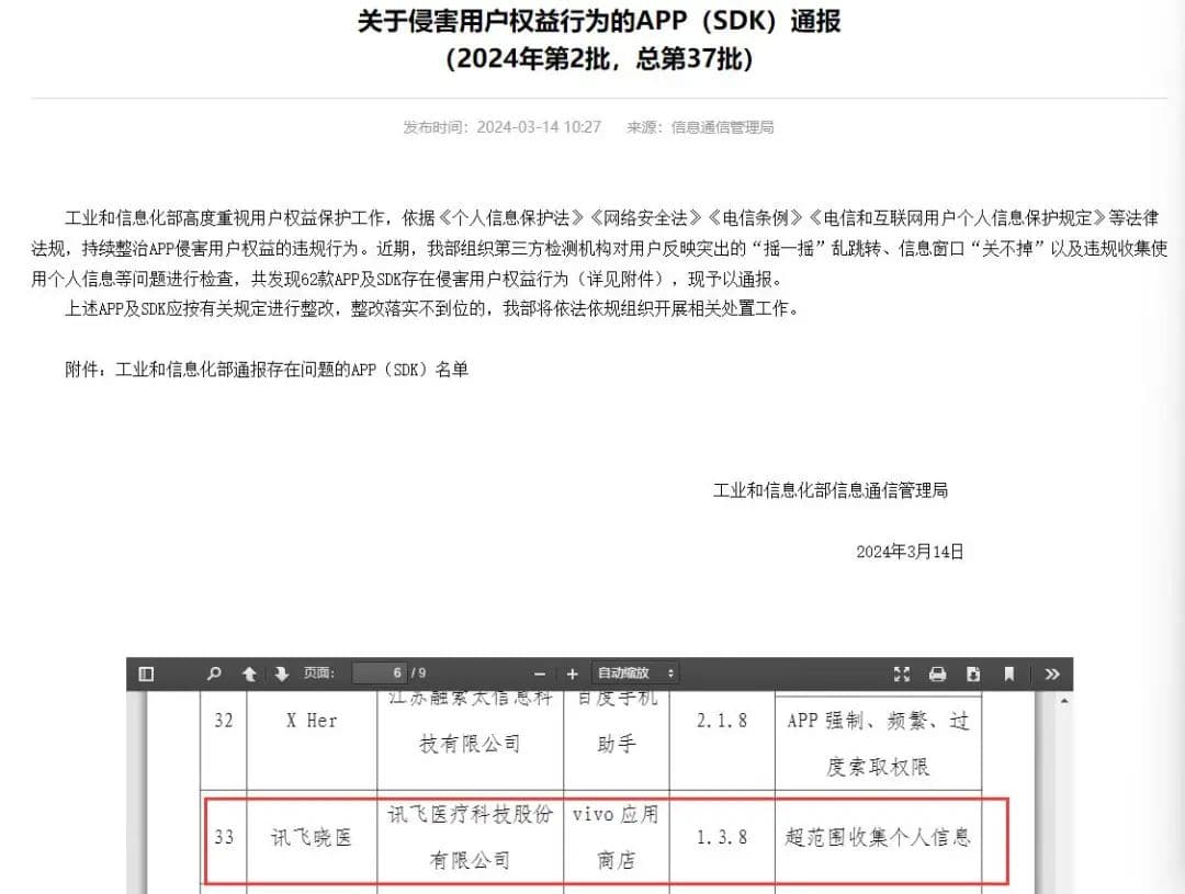 工信部今年3月发布“关于侵害用户权益行为的APP(SDK)通报(2024年第2批,总第37批”),其中,讯飞医疗旗下应用“讯飞晓医 (版本号:1.3.8)”在列,涉及问题为“超范围收集个人信息”。