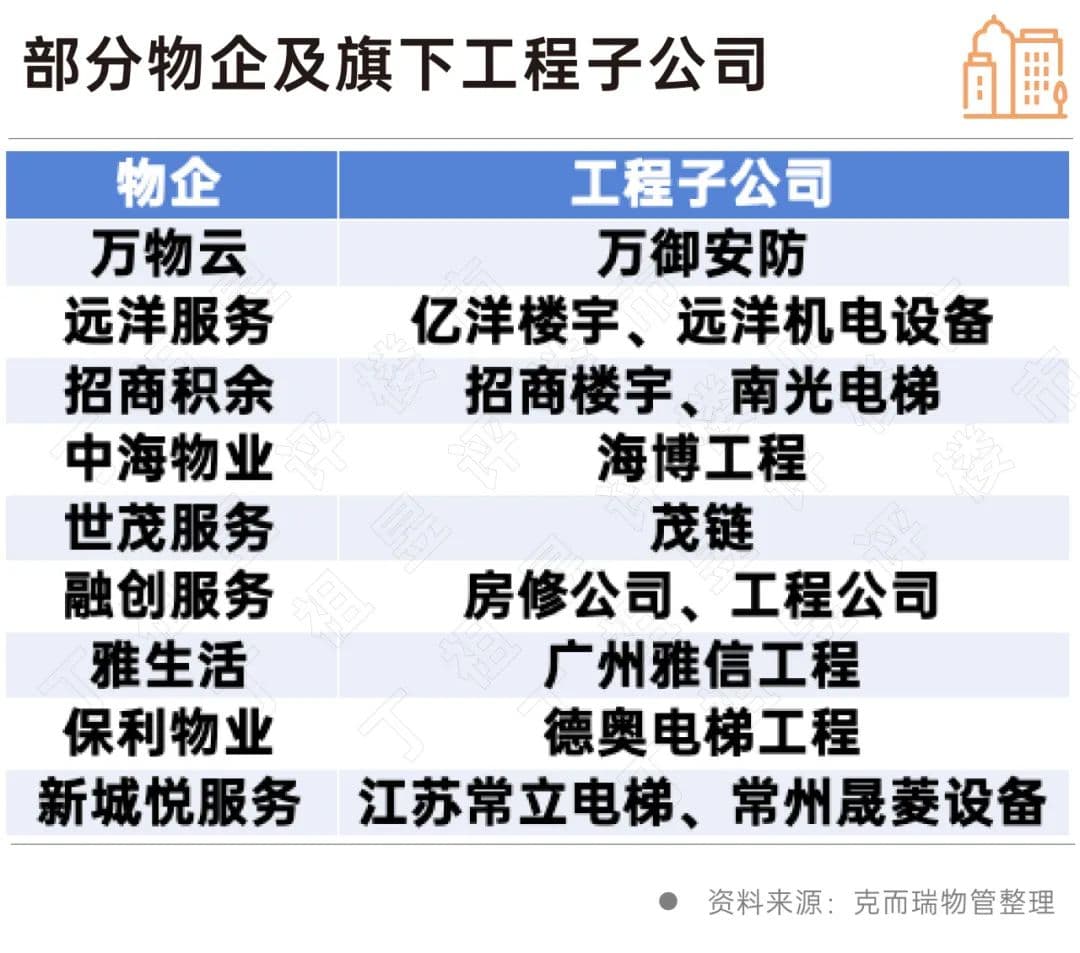品牌物企积极布局工程维修业务,意在分得一杯羹。如万物云早在2021年5月便发布安防机电服务品牌“万御安防”,主营业务有安防科技、机电业务和人力资源服务,业务范围已覆盖全国超100个大中城市,服务项目超4000个。又如中海物业于2023年7月焕新发布To B增值服务子品牌“海博工程”,在统筹五家专业公司的基础上,海博工程实施“一线五链”发展战略,即围绕建筑生命时间线,聚焦房产开发、物业工程、能源管理、企业孵化和物资采购五大业务链条。