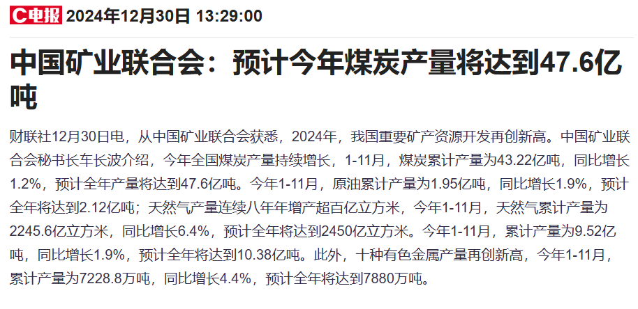 再者中国矿业联合会在昨日表示,2024年我国重要矿产资源开发再创新高。中国矿业联合会秘书长车长波介绍,今年全国煤炭产量持续增长,1-11月,煤炭累计产量为43.22亿吨,同比增长1.2%,预计全年产量将达到47.6亿吨。