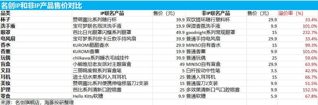 这里面的动机其实很容易理解,大家可以根据下表感受一下,同样的产品,只要把相应的IP元素融入进去,在“情绪价值”的加成下溢价率少说提升30%,多则翻倍甚至更多。根据名创2024Q1的公开交流,当前名创的产品结构已经从过去100%性价比产品升级为70%性价比+30%IP产品,IP产品占比的提升也带动名创的毛利率从26%大幅提升到37%,可以肯定的是,未来IP产品占比提升将成为了名创未来一大核心看点。