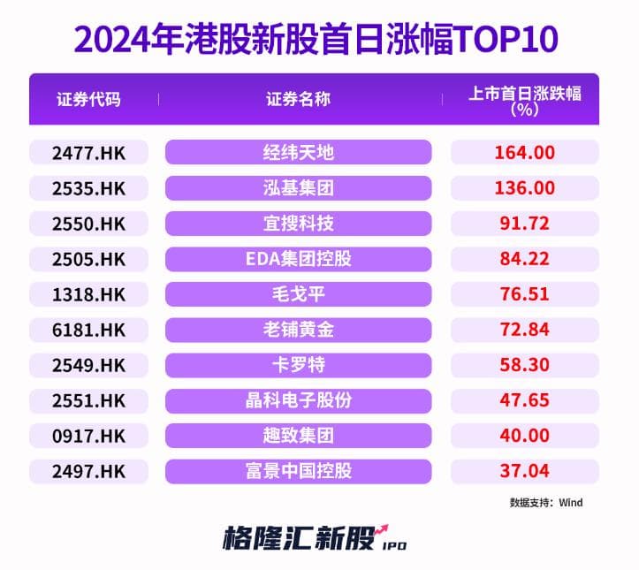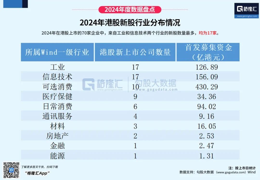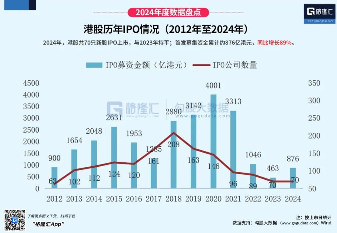 2024年,港股共70只新股IPO上市,上市新股数量与2023年持平。