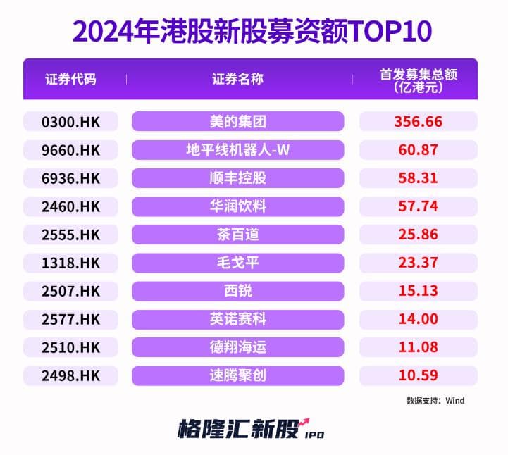 2024年,港股IPO募资金额排名前三的新股分别是美的集团、地平线机器人-W、顺丰控股,分别募资356.66亿港元、60.87亿港元、58.31亿港元,三家公司合计募了475.84亿港元,占到今年港股IPO募资总额的54.3%。
