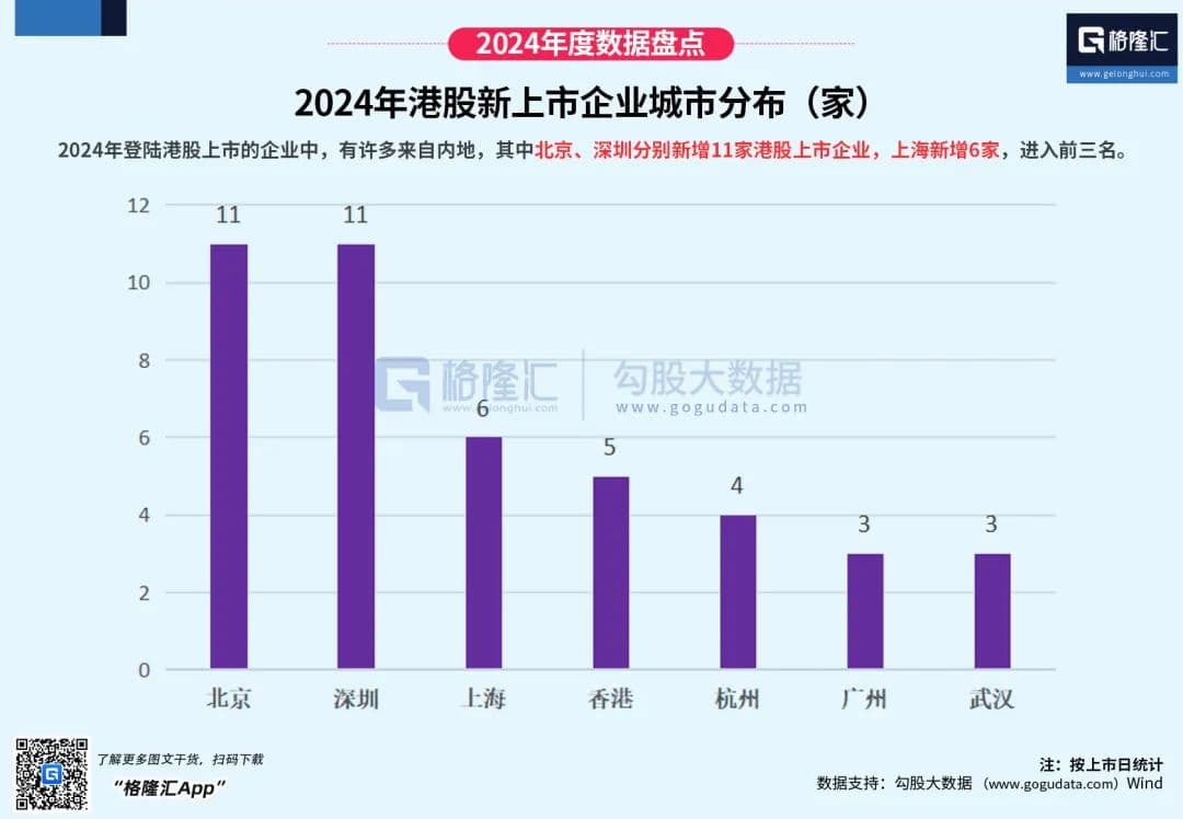 2024年登陆港股上市的企业中,有许多来自内地,其中北京、深圳分别新增11家港股上市企业,上海新增6家,进入前三名。