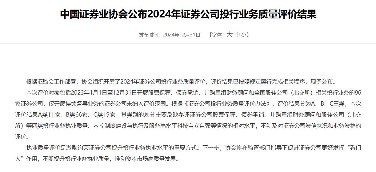 财联社12月31日讯(记者林坚)券商2024年投行业务、债券业务以及财务顾问业务三项执业质量评价结果出炉。执业质量评价是激励约束券商提升投行业务执业水平的重要方式。根据12月31日中证协官网发布的情况,三大结果如下: