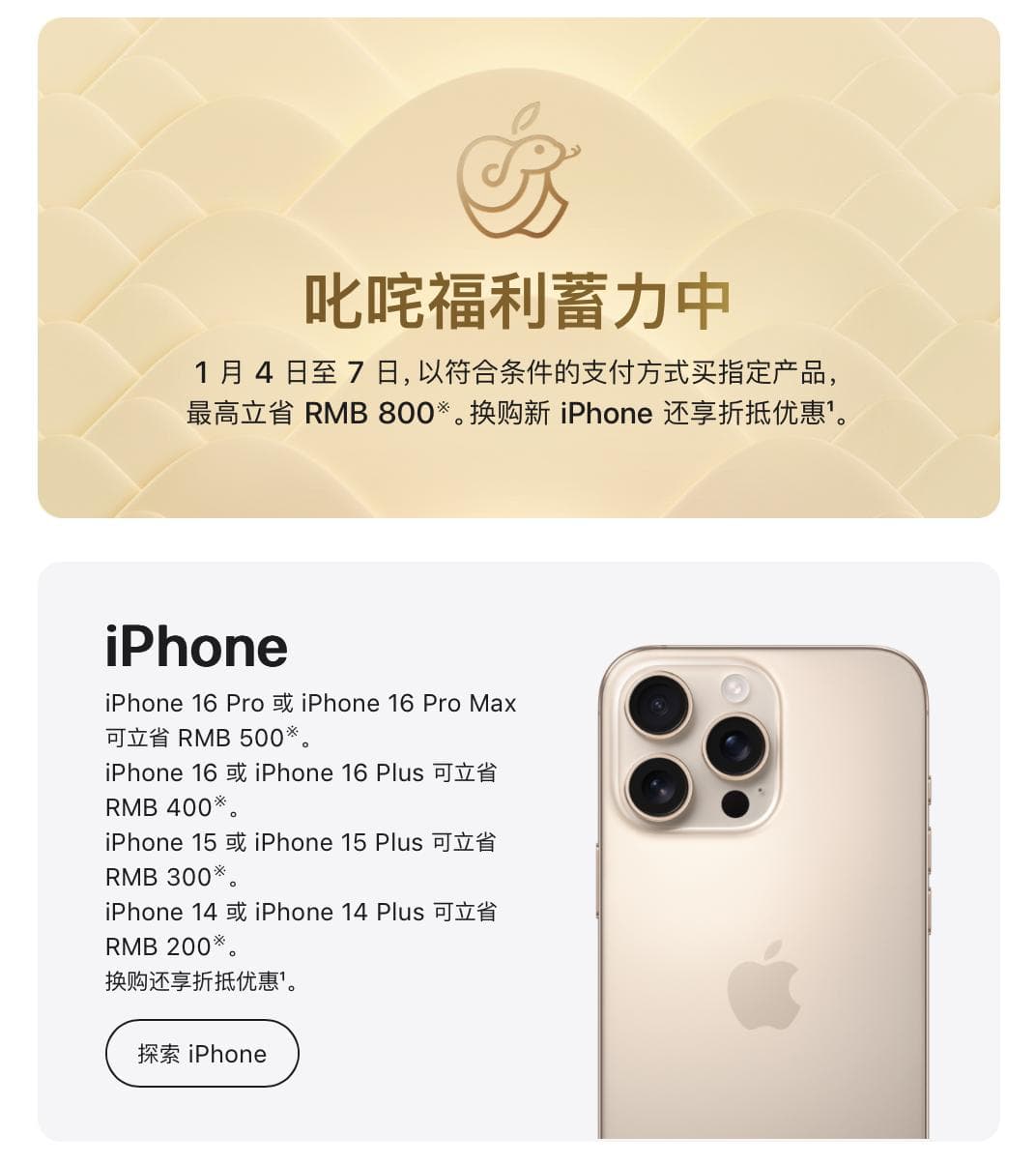 1月2日,苹果中国官网公布新年促销活动,活动期间(1月4日-7日)购买指定商品,最高立省800元人民币,换购新iPhone还享折抵优惠。