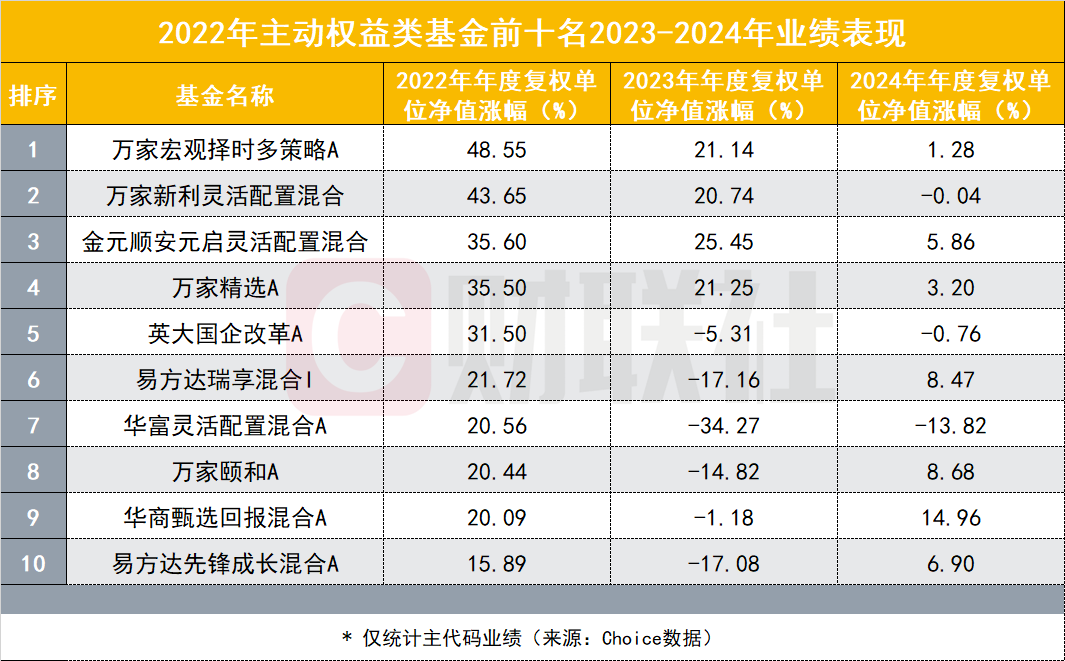 部分基金维持了稳健收益。以华夏北交所创新中小企业精选两年定开混合发起为例,该基金在2023年以超过58%的收益位列主动权益冠军,2024年继续实现了28.16%的亮眼全年收益。此外,万家宏观择时多策略混合、金元顺安元启灵活配置混合在2022年业绩排名前10,2023年的全年收益均超过20%。