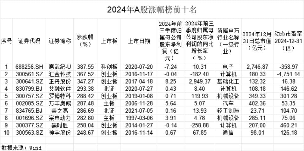 Wind(万得)数据显示,剔除2024年上市的新股,2024年翻倍股数量达到94只,其中寒武纪(688256.SH)以387.55%的涨幅位居第一,汇金科技(300561.SZ)、正丹股份(300641.SZ)年内涨幅也超三倍。另外,还有艾融软件(830799.BJ)、罗博特科(300757.SZ)等17只个股累计涨幅超两倍。