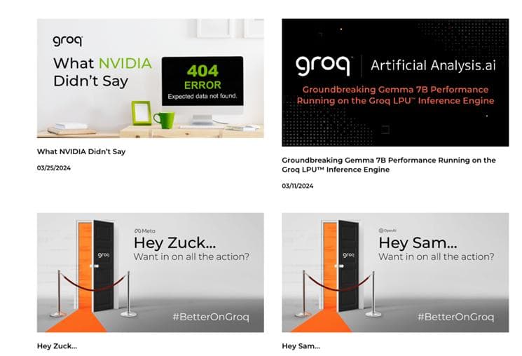 先说Groq,这家创企由前谷歌TPU核心团队的“8叛将”于2016年创办,平时喜欢在官博“喊麦”,代表作为《Hey Zuck...》《Hey Sam...》《Hey Elon...》等等。