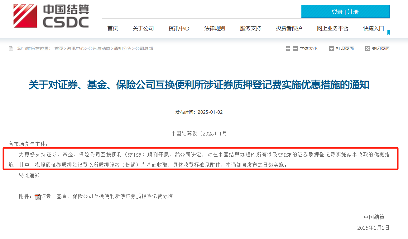与此同时,中国结算于当日A股盘前发布通知,为更好支持证券、基金、保险公司互换便利顺利开展,决定对在中国结算办理的所有涉及SFISF的证券质押登记费实施减半收取的优惠措施,其中,港股通证券质押登记费以所质押股数(份额)为基础收取。