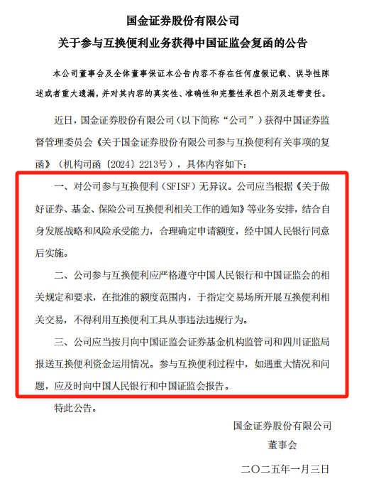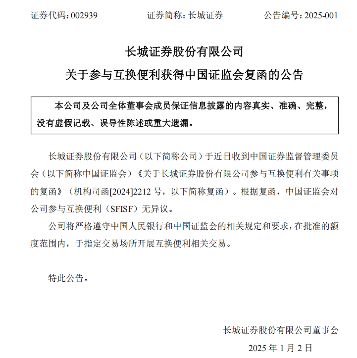 1月2日,长城证券与国金证券同日公告,证监会对两家公司参与互换便利(SFISF)无异议。