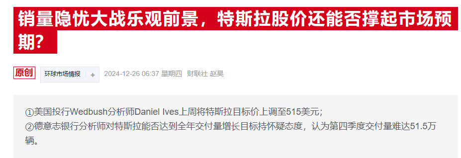 具体数据显示,特斯拉2024年第四季度汽车产量为459,445辆,同比下降超7%;交付量录得495,570辆,同比上升约2.3%,但低于分析师此前预计的504,770万辆。