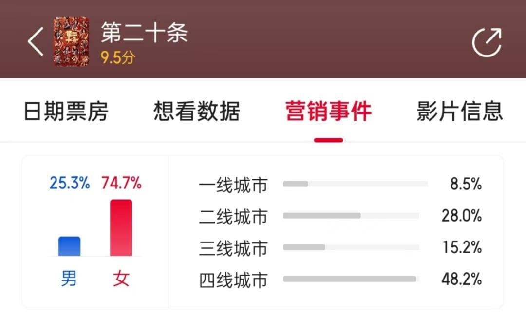 根据猫眼数据,《第二十条》《飞驰人生2》《热辣滚烫》等喜剧电影三四线城市观众的占比均达到了60%以上。《第二十条》用轻喜剧的外壳包装法律与正义的深刻议题,以小人物的奋斗和抗争为视角,打破严肃题材的距离感,既满足情感宣泄,又留下思考空间。喜剧电影已经超越单纯的娱乐功能,成为情感连接和社交表达的重要载体。