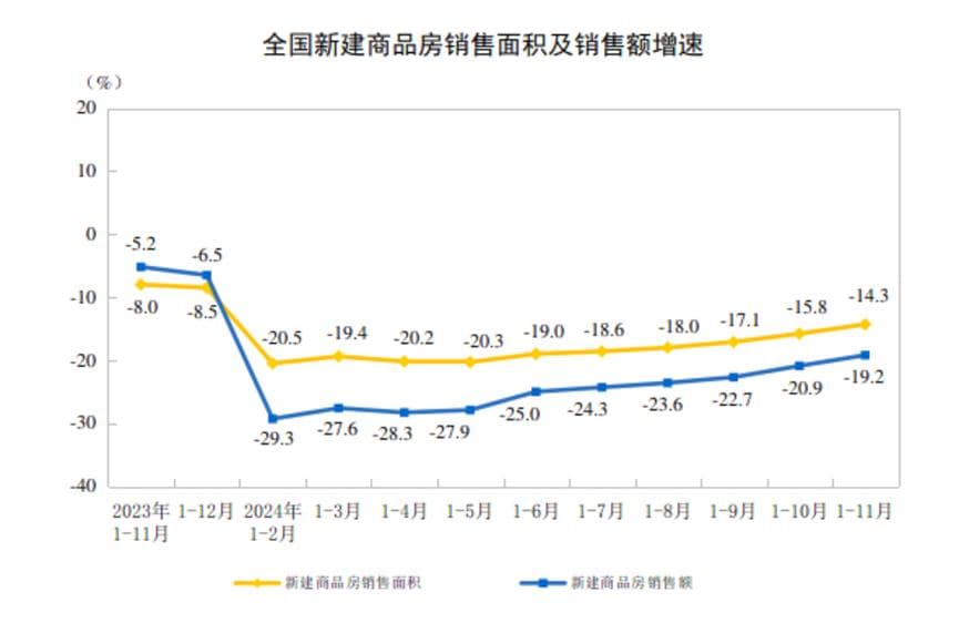然而遗憾的是,近年来,因需求饱和、经济承压,中国房地产行业已迈入“黑铁时代”。国家统计局披露的数据显示,2024年1月-11月,中国新建商品房销售面积86118万平方米,同比下降14.3%;新建商品房销售额85125亿元,同比下降19.2%。