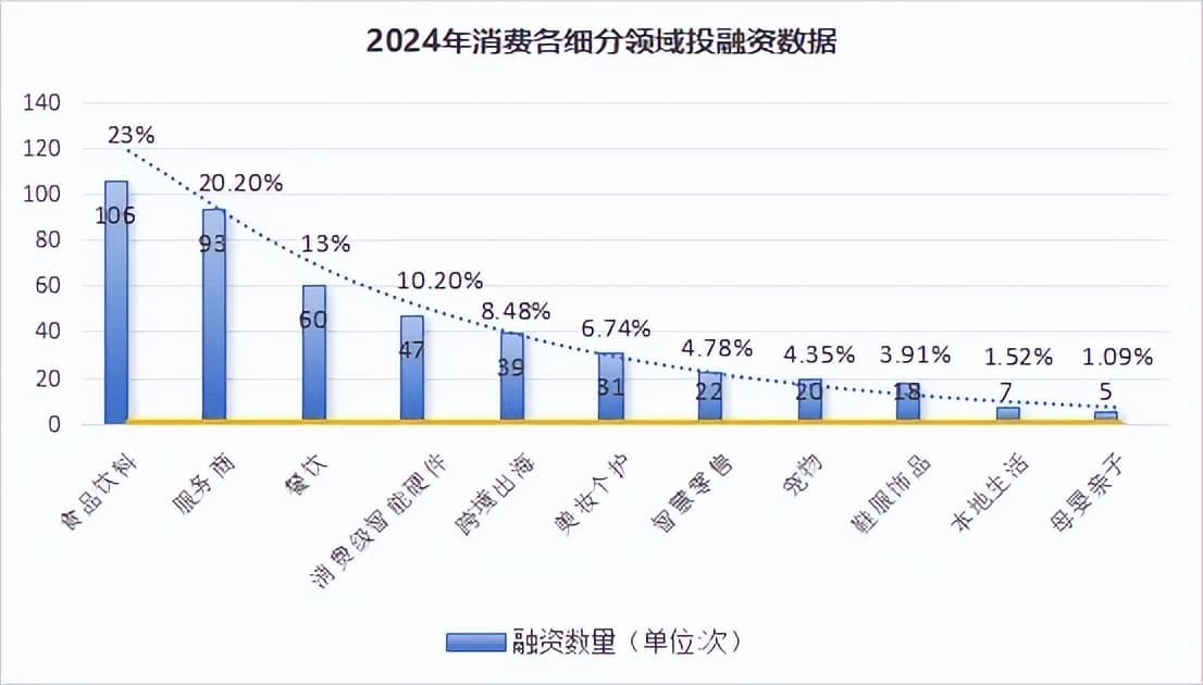 与2023年相比,食品饮料,餐饮、消费级智能硬件、美妆个护、宠物等领域的投融资数量都有所下降,但依然领先于其它细分赛道。