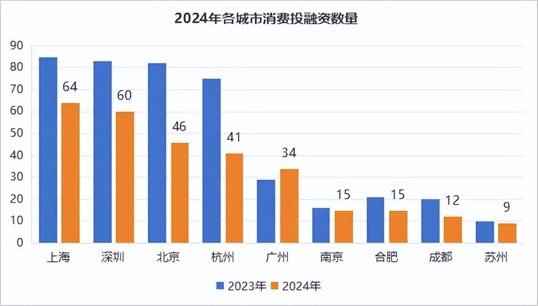 具体来看,获得投融资数量最多的5个城市分别是上海、深圳、北京、杭州、广州,分别有64、60、46、41、34起投融资事件,合计占比约为53.3%,与2023年基本保持一致。