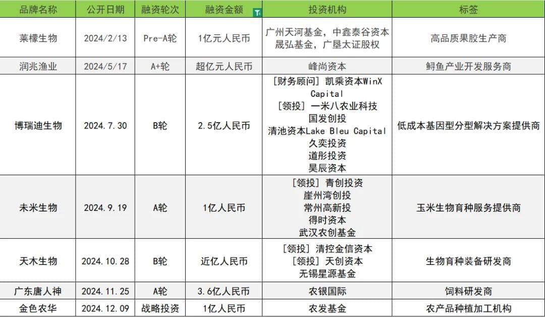 食饮品产业上游的农业项目受到资本关注。据蓝鲨消费不完全统计,至少有超过30家从事农副产品种(养)植、加工、生物技术研发和供应链的企业获得投资。其中,未米生物、广东唐人神、天木生物、莱檬生物、金色农华等都获得亿元或超亿元级投资。