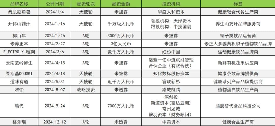比如运动健康饮品ELECTRO X 粒刻、主打“超低体内存储、超低热量”系列食用油脂产品的脂代都获得千万元投资;而健康轻食代餐生产商暴肌独角兽、膳食营养补充剂品牌运营商和澍生物等都在早期天使轮就获得投资。