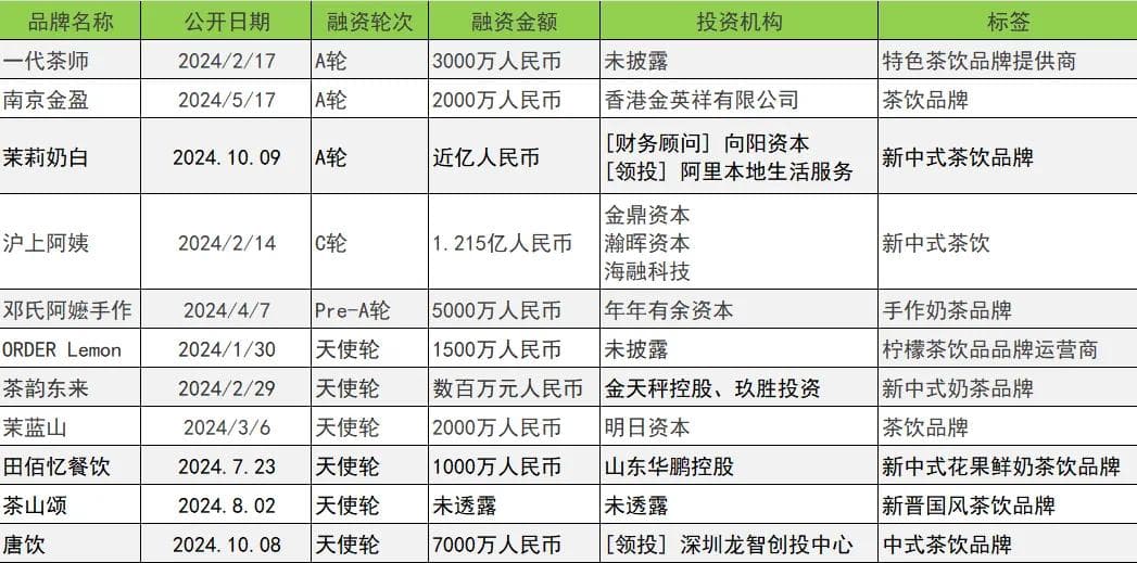 二是,新茶饮热度持续,规模化品牌疯狂卷上市。不考虑IPO轮次的话,2024年现制茶饮相关投融资11起,资本加码沪上阿姨、茉莉奶白等规模化茶饮品牌。获得弹药的茉莉奶白在今年加速拓店,2024年2月至现在已新开近500家门店。