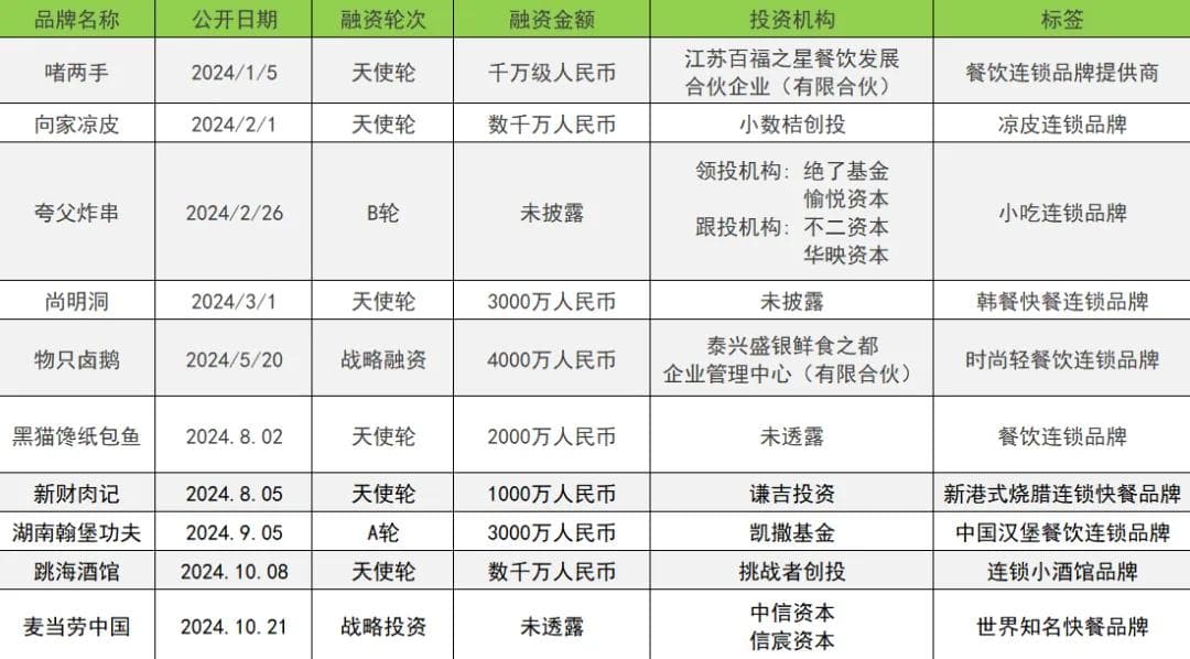 三是,中式连锁餐饮品牌获资本青睐。多家中式连锁餐饮品牌获千万级投融资,黑猫馋纸包鱼、尚明洞、向家凉皮、啫两手都在天使轮就获得千万级投资。