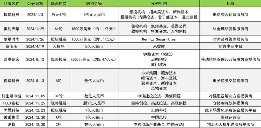 不考虑IPO轮次的话,2024年有93家服务于消费类企业的服务商获得投资,其中亿元级投融资11起。细分来看,服务商领域的投资聚焦于包材、综合电商服务、营销数字化、供应链服务、品牌运营服务、冷链物流、餐饮管理服务等诸多领域。