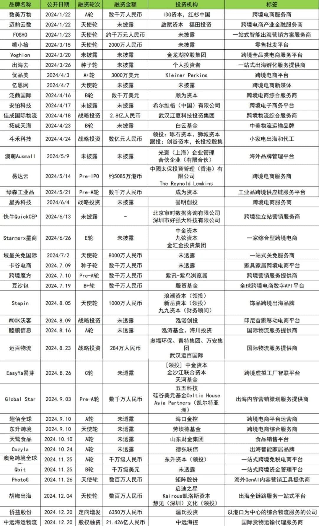 据蓝鲨消费不完全统计,不考虑IPO轮次和未披露具体金额的投融资事件的话,2024年跨境出海领域的投融资近40起,覆盖跨境电商、跨境综合服务、跨境营销等各领域,3家跨境出海企业融资金额过亿。