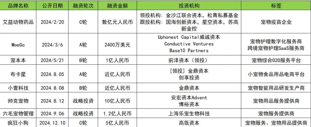 宠物:投融资事件20起,最大一笔投资达10亿元