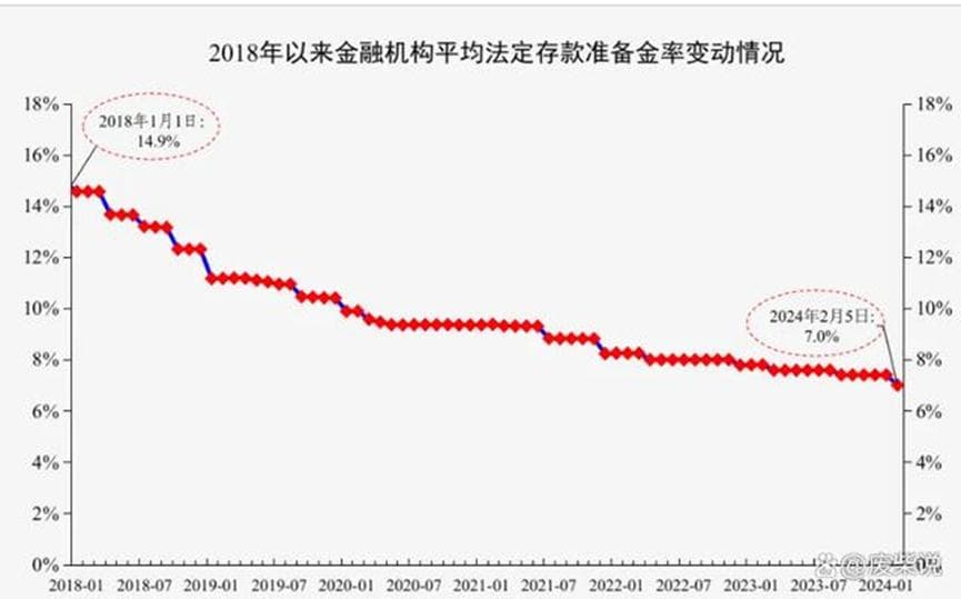 过去几年从2018年开始,中国就在不断持续通过降低存款准备金率向市场投放了大量流动性。截止到2024年12月,准备金率就从过去14.9%下降到7%左右。相当于6年向市场投放13.4万亿流动性,平均下来每年大概2.2万亿!