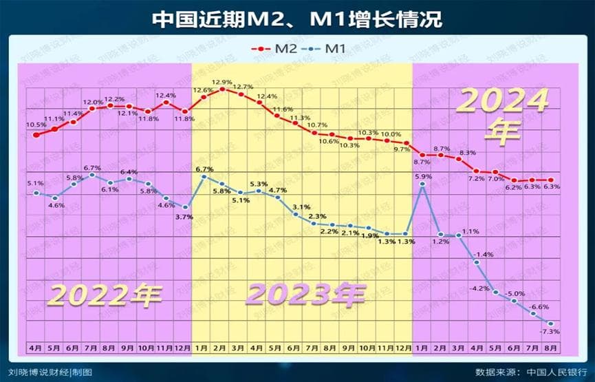 其二、22年、23年央行多次降准降息,这导致M2大幅增长,但是最终企业以及个人拿到这些钱之后都倾向于放进银行,甚至存为定期存款。
