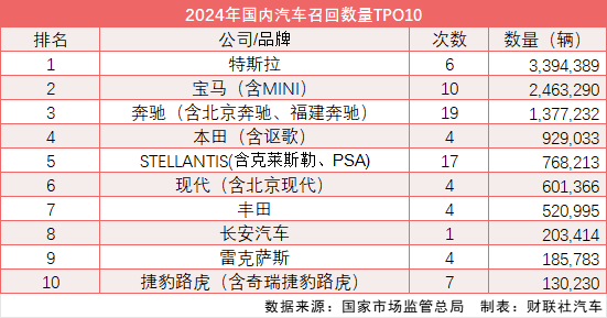 2024年汽车缺陷产品“召回榜”:特斯拉、宝马、奔驰位列前三 OTA成重要召回方式