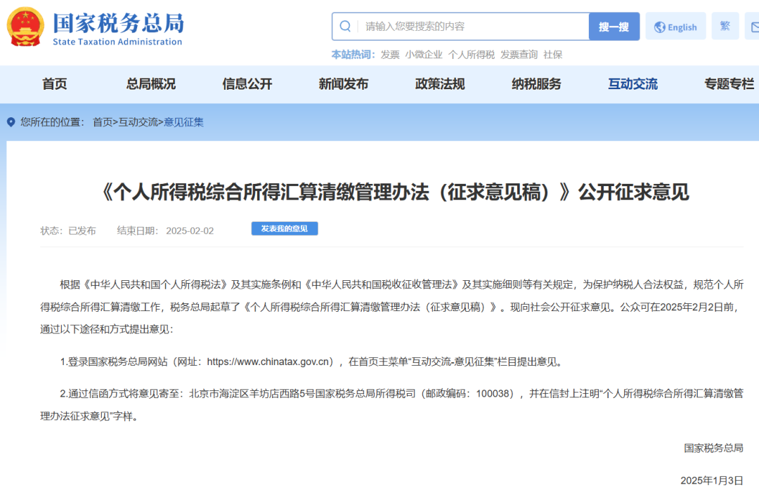 根据《中华人民共和国个人所得税法》及其实施条例和《中华人民共和国税收征收管理法》及其实施细则等有关规定,为保护纳税人合法权益,规范个人所得税综合所得汇算清缴工作,税务总局起草了《个人所得税综合所得汇算清缴管理办法(征求意见稿)》。现向社会公开征求意见。公众可在2025年2月2日前,通过以下途径和方式提出意见: