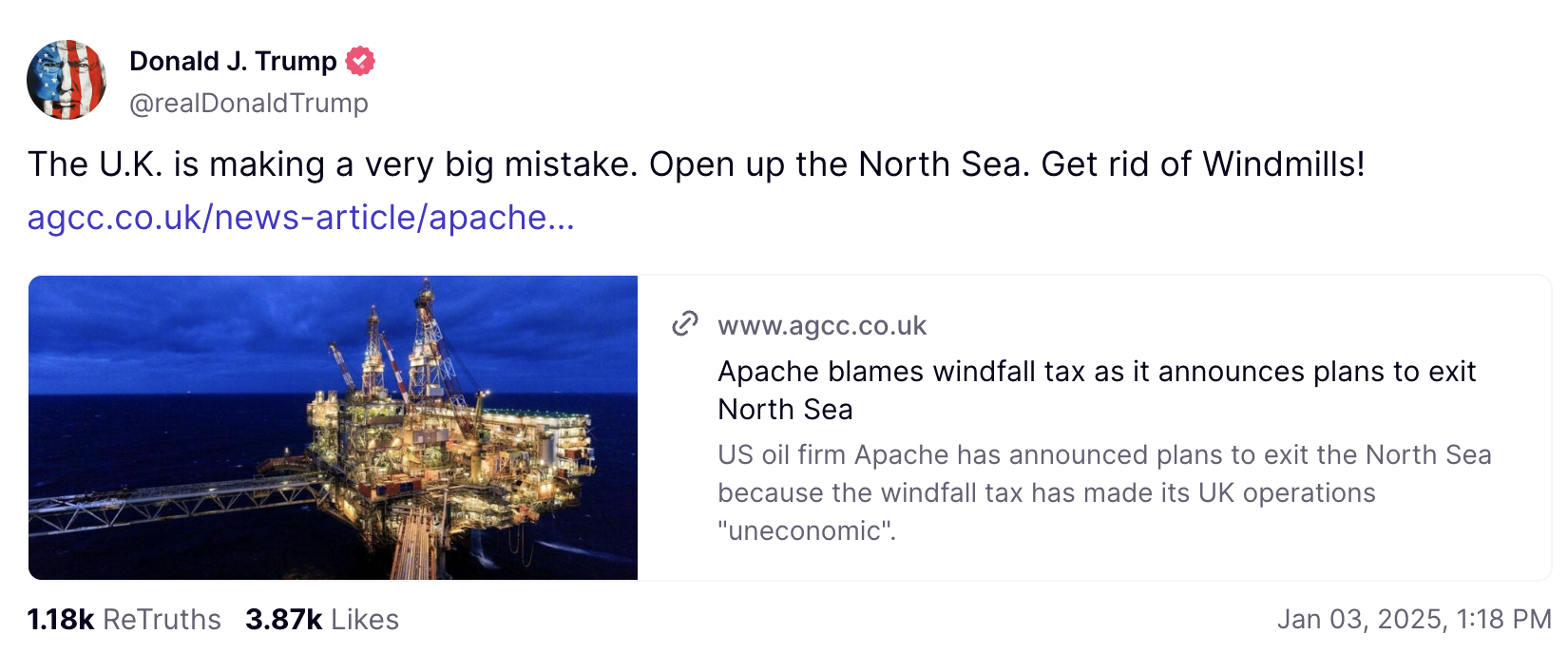 特朗普的帖子是在回应有关美国油气公司Apache计划在2029年底前退出北海的报道。Apache将其退出北海的原因归咎于英国政府对油气行业加征暴利税,导致无利可图。