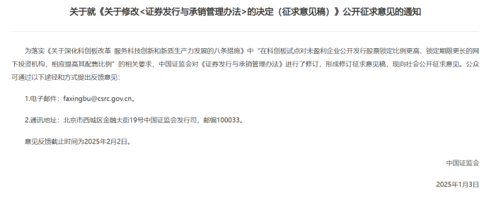 时间拨回2024年,彼时6月19日,证监会发布《关于深化科创板改革 服务科技创新和新质生产力发展的八条措施》,其中提出要开展深化发行承销制度试点,在科创板试点对未盈利企业公开发行股票锁定比例更高、锁定期限更长的网下投资机构,相应提高其配售比例。为贯彻落实“科创板八条”,到了今年1月3日,证监会称,拟对《证券发行与承销管理办法》进行修改,授权证券交易所制定分类配售的具体要求。同时,根据《公司法》《上市公司股东减持股份管理暂行办法》等的修订情况,对涉及条款相应修改,正式向社会公开征求意见。