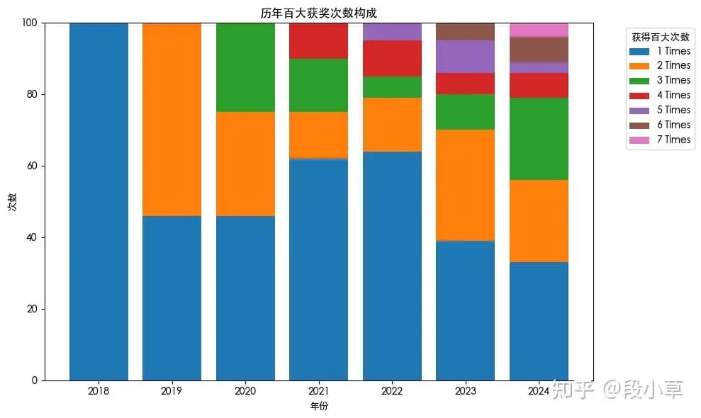 知乎大模型、Python 话题优秀答主@段小草统计了今年的榜单,并向36氪授权发布了他的统计结果。结果显示,自 2018 年以来,七年的 700 位百大 UP 主去重后,共有 390 位(去年是 357 位),也就是说,过去一年跑出来的优秀新人并不多。