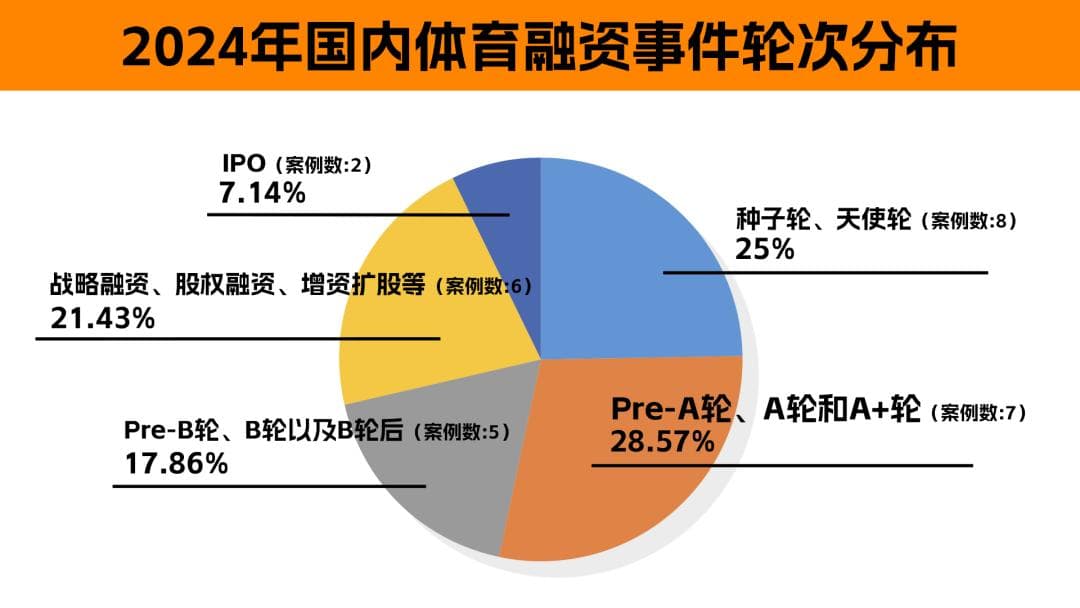 亿元级别“大单”方面,国内体育领域共有3起亿元级别投融资(占事件总数的10.71%),金额约合5.91亿人民币(约占总额的58.78%)。至于投融资轮次分布方面,2024年,国内体育领域的投融资事件仍然高度集中于早期轮次。