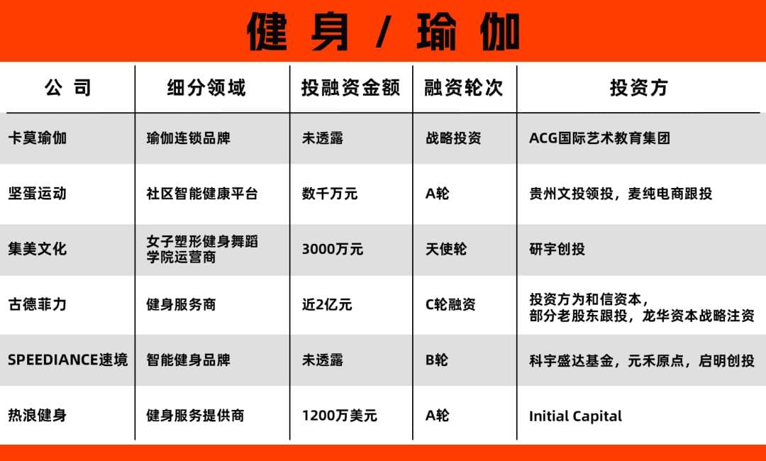 此外,社区智能健康平台坚蛋运动完成了由贵州文投领投、麦纯电商跟投的数千万元A+轮融资;女子塑形健身舞蹈学院运营商集美文化完成3000万元天使轮融资;2023年刚刚完成一笔5000万元A+轮融资的SPEEDIANCE速境再度在今年完成B轮融资。