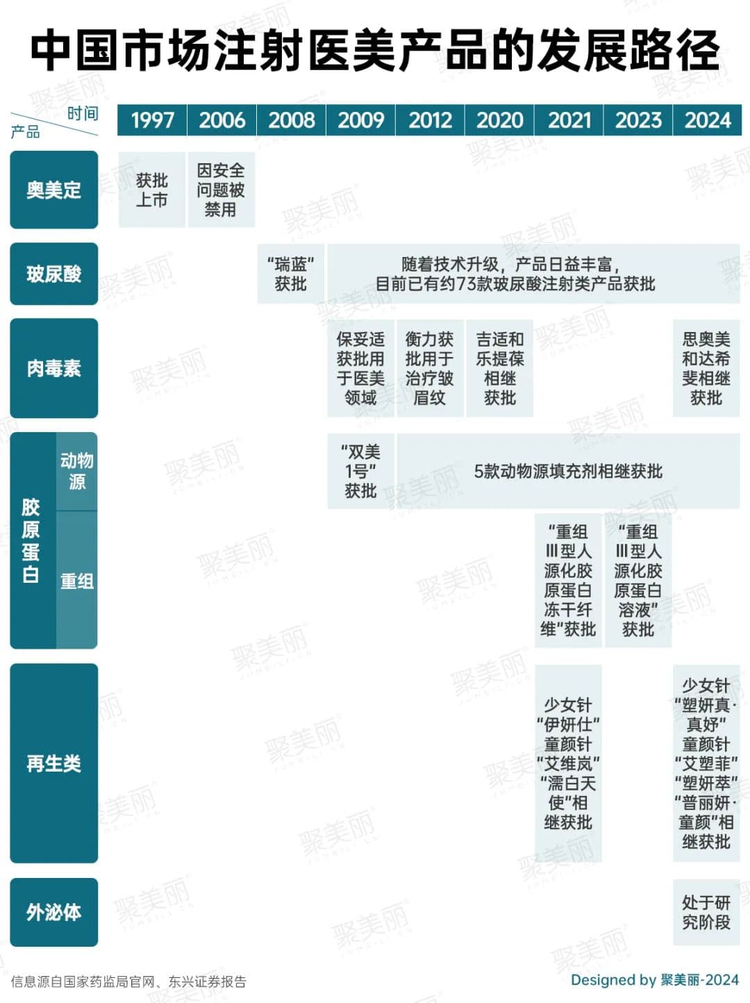 从玻尿酸、肉毒素到重组胶原蛋白,再到再生材料类、外泌体,可以看到,注射医美市场在产品的更替中不断向前发展。