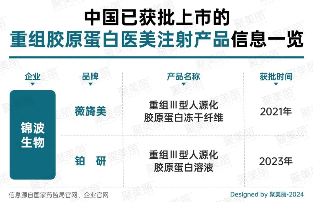 不过,作为注射填充类针剂,重组胶原蛋白注射产品却存在着较高的技术壁垒,而且审批周期漫长,监管也更加严格,至今仅有锦波生物旗下的薇旖美和"铂研"胶原针成功获批,被视为一片蓝海。