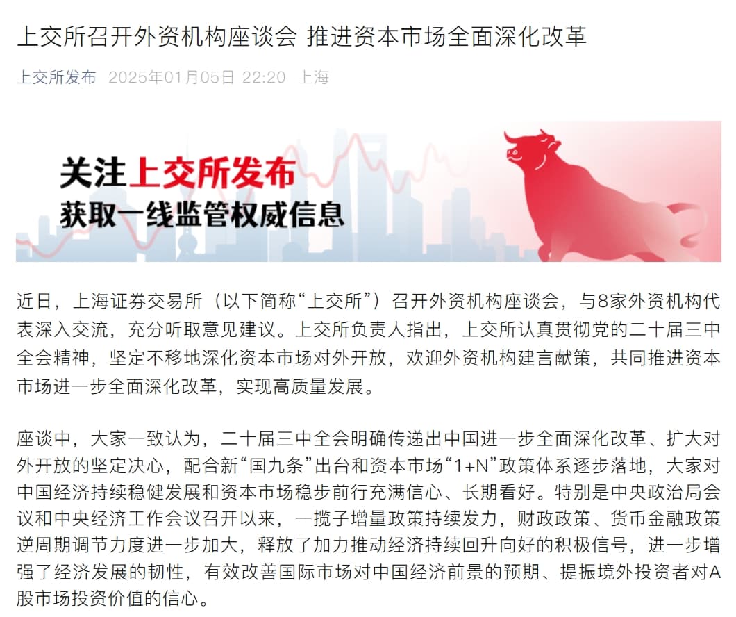 财联社1月5日讯,近日,沪深交易所分别召开外资机构座谈会,与外资机构代表深入交流,听取意见和建议。