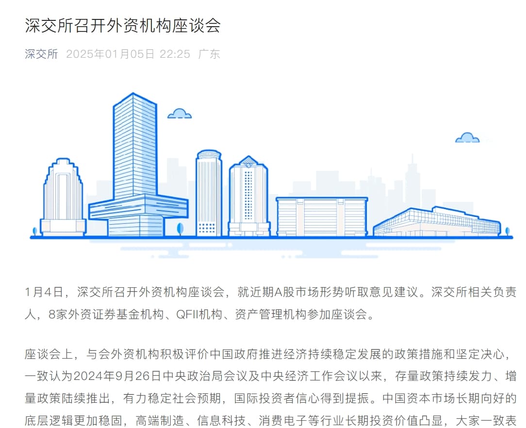 据深交所消息,1月4日,深交所召开外资机构座谈会,就近期A股市场形势听取意见建议。深交所相关负责人,8家外资证券基金机构、QFII机构、资产管理机构参加座谈会。