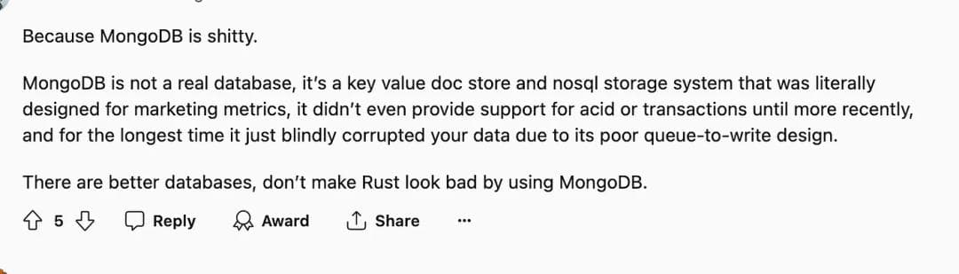 除了 Rust 的设计缺陷,社区氛围也是难评。Austin 表示,社区不能接受别人提出 Rust 有缺陷这个观点。发表的看法会遭到攻击,提出的问题也只能收获阴阳怪气。