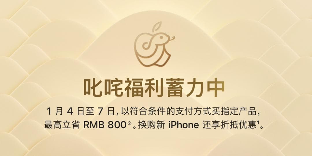 1月4日至7日,苹果在中国市场推出叫“叱咤福利”的新年活动,最高立省800元,覆盖iPhone、iPad、MacBook等产品线。