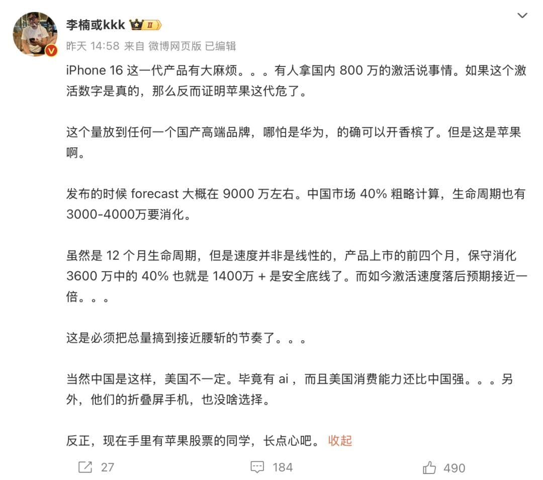 原本预期销量在9000万部左右,按照中国市场40%粗略计算,国内iPhone 16系列生命周期至少要卖出3000-4000万部。
