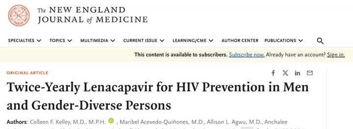 临床3期PURPOSE 1试验中期分析结果显示每半年注射1次的HIV-1衣壳抑制剂来那帕韦预防女性HIV,显示100%有效性!